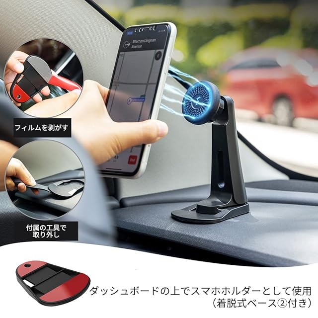 【付属の2タイプベース】着脱式ベース①[底部に滑り止めパッド]卓上スタンドとして使用する時、スタンドの安定性を高め、携帯を保護できます;着脱式ベース②[底には粘着性のある]車のダッシュボードに貼り付けて使用することができます。