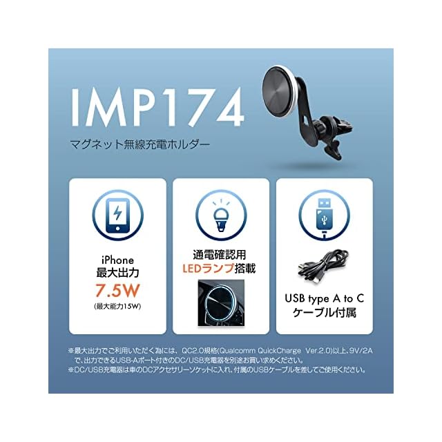 iPhone12/13/14シリーズを最大7.5Wで充電します。(MAX7.5W充電の場合はQC 2.0以降のUSB電源が必要となります。その他の電源はMAX 5W充電となります。) 対応機種 IPhone14 Plus IPhone14Pro IPhone14ProMax IPhone 13, iPhone 13 Pro, iPhone 13 Pro Max, iPhone 13 mini, iPhone 12, iPhone 12 Pro, iPhone 12 Pro Max, iPhone 12 mini Magsafeケース