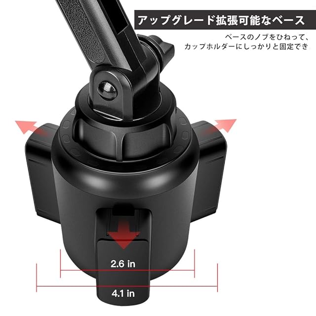 【最新車用カップホルダー 携帯電話】カップ状のフォーンホルダーベースと伸縮自在な部分はやわらかいシリコンで囲んでおります。車のカップホルダーのサイズに応じて、ノブを優しく調整するだけでカップ型ベースは2.6インチから4.1インチまで調整できます。しっかりとカップホルダーに固定されます。追加の工具は必要ありません。前世代のスマホカップホルダーと比較して、クランプの両側に個別にリリースボタンを備えたアップグレード電話クランプ。さらに、延長可能な脚があるので、保護ケースを付たままの携帯電話でも適しています。