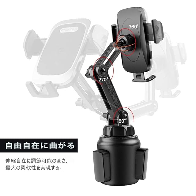 【調節可能な伸縮ネック車載ホルダー スマホ】この長さ22cmから28cmまで伸縮自在、それに270度回転調節のネックで設計されたスマホ 車載ホルダー ドリンクはさらにスマートフォンの操作やアクセスがしやすくなりました。他の携帯電話ホルダーのように車の画面やボタンを遮ることはありません。 電話をかけたり、ナビ、音楽の聴取、充電のいずれの場合でもご両手を解放し安全な運転を保証して、あなたに最高の運転体験をお届けします。