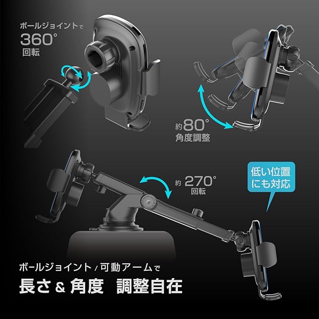 キャパシタ内蔵 / エンジンOFFの状態でも電動でアームが開閉、角度&長さ調整自在 伸縮式吸盤アーム
