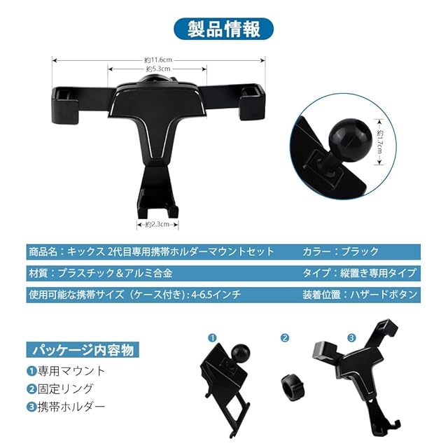 <b>■ 適応車種</b><br> 日産 キックス P15 2020 2021 2022<br> ※年式やグレードにより、ハザードボタンの形状が異なる場合がございます。画像にて形状をよくご確認下さい。<br> <br> <b>■ 専用設計</b><br> ステーが専用設計のため、吸盤やルーバー式のように、たまには運転中に落ちたり、脱いだりことはありません。<br> <br> <b>■ 邪魔にならず</b><br> 車内が狭く、つける場所がないと悩む方へ。車内の純正パーツに挟み込むタイプで、車内狭い収納スペースには大変助かるのでしょう。<br> <br> <b>■ 装着簡単</b><br> 挟み込むタイプのため、取り付けは大変簡単です。スマホの充電に邪魔しません。4 ~6.5インチディスプレイの携帯電話が取り付け可能です。<br> <br> <b>■ 車載ホルダー</b><br> 角度調整可能。お好み視覚角度まで調整できます。ホールド性もバッチリ!<br> <br>