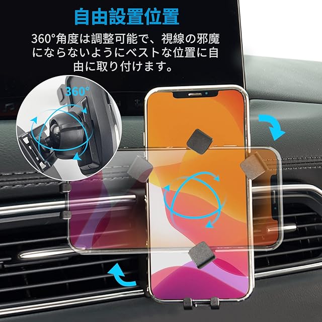 【360度回転&自由調節】cx-5 車載ホルダーは手元近くまで伸びるのは便利になります。ボールジョイント機能付いて、アームも角度調整可能、お好み視覚角度まで調整できます。360°角度は調整可能で、視線の邪魔にならないようにベストな位置に自由に取り付けます。車載ホルダーの真下に充電用の位置があります。車載ホルダーの固定部分はゴム製なので、スマホ本体を傷つけません 。
