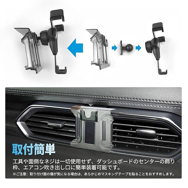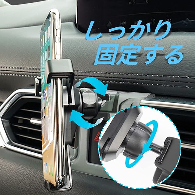 【クリップ式&取付簡単】cx-5 スマホホルダー kfは工具や面倒なネジは一切使用せず、ダッシュボードのセンターの飾り枠、エアコン吹き出し口に簡単装着可能です。挟み込むだけのタイプなので、取り外す時も簡単です。高品質な素材が採用され、揺らない、落ちない、異音なし、ガッチリ固定できます。※ご注意:取り付け面の傷が気になる場合は、あらかじめマスキングテープを貼ることをおすすめします。