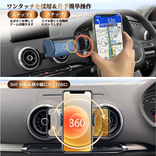 【片手操作、取り付け簡単】スタンドのサイドボタンを押すと、1秒だけでアームの展開が完了します。携帯電話を置いた後、アームはすぐに引っ込められ、携帯電話をしっかりとロックします。上記のすべては片手で行うことができます。設置方法も簡単です。スマホホルダーのベースを水平に中央の位置に置き、最初に一方の端をエアアウトレットフレームに挿入します。もう一方の端も反対側のエアアウトレットフレームに埋め込みます。ベースを固定した後、2つのエアアウトレットフレームをしっかりと押します。次に、ベースのボールヘッドとブラケットをスイベルナットで接続して、取り付けが完了します。