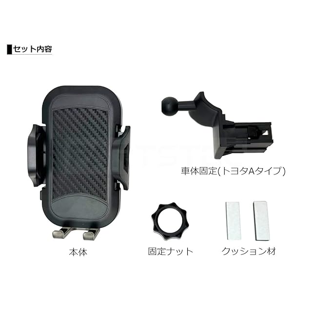 <b>【 商品詳細 】</b><br>・色 : ブラック / 黒<br> ・素材 : プラスチック<br> ・ワンタッチ自動ロック式<br> ・360度角度調整可能<br> ・埋め込み部サイズ : 36mm × 28mm × 34.5mm (縦×横×奥行)<br><br> <b>【 セット内容 】</b><br>・スマホホルダー 本体 ×1<br><br> <b>【 参考適合 】</b><br>・トヨタ<b>タイプAスイッチ</b>汎用<br> ※必ず取り付け予定の車両の空ポートのサイズをご確認ください。<br><br> <b>【 注意事項 】</b><br>※磁気に影響を受ける物の近くには置かないでください。<br> ※重量のある端末などは落下する恐れがあります。<br> ※商品サイズを必ずご確認の上ご購入下さい。<br> ※本商品は検品後の発送となりますので開封の跡が残る場合がありますがご理解下さい。<br> ※新品ですが海外製品になりますので、輸送中の傷や汚れがある場合も御座いますがご理解下さい。<br> ※取付けに関してのサポートは行っておりませんので、自信のない方は専門業者にてお取り付けください。<br> ※取付けに関する工賃等につきましてはお客様ご負担となります。いかなる場合でも工賃等の保証はございません。<br> ※取り付けは自己責任でお願いします。取り付けの際の破損等も当方では責任を負いかねます。<br> ※万が一本製品により生じた事故・障害・損害等は、弊社では一切の責任を負えませんのであらかじめご了承下さい。<br> ※初期不良の場合、商品到着後7日間以内に限りご対応とさせていただきます。お早目に確認の方よろしくお願い致します。<br><br>