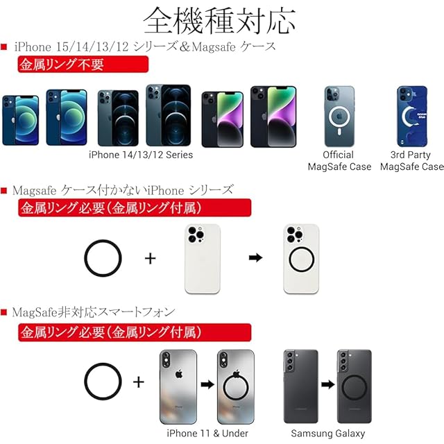 【金属リング付属】MagSafe非対応スマートフォンと通常携帯ケースは付属金属リングが後ろに貼るだけでも利用できます。