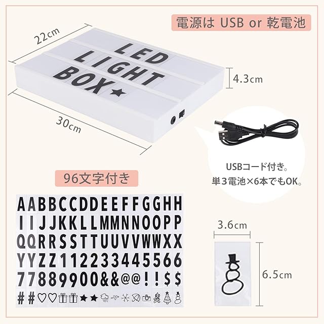 【文字や特別記号】製品のサイズ:30×22×4cm 個性な文字や特別記号が96文字付いているLEDライトボックスです。