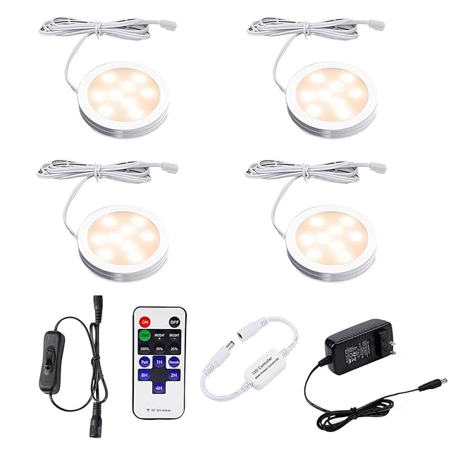 AIBOOキャビネットライトライト 調整可能LED照明 ラジコントロール12 Vプラグインアダプタのスタンド上照明装置 超薄ボールランプ 食器棚 本棚ショーケース ワインキャビネット タンスなどに適用4個セット (電球色3000K)