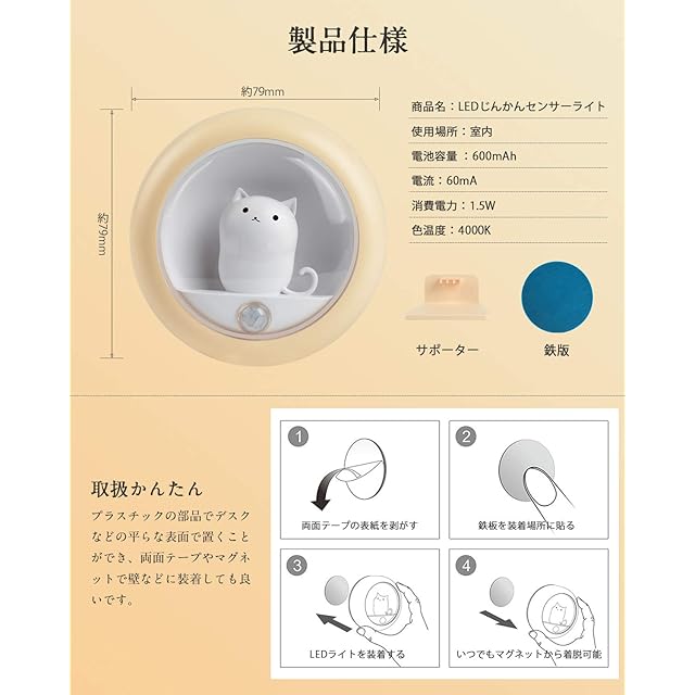 「商品仕樣」商品名:LEDじんかんセンサーライト / 入数:1個入り / 色:ホワイト / 使用場所:室内 / 電池容量 :600mAh / 電流:60mA / 消費電力:1.5W / 色温度:4000K / ご購入日から1年間のが付いており、もし、商品に何か不具合、ご使用中何か不明点や問題がありましたら、いつでもお気軽にご連絡ください。