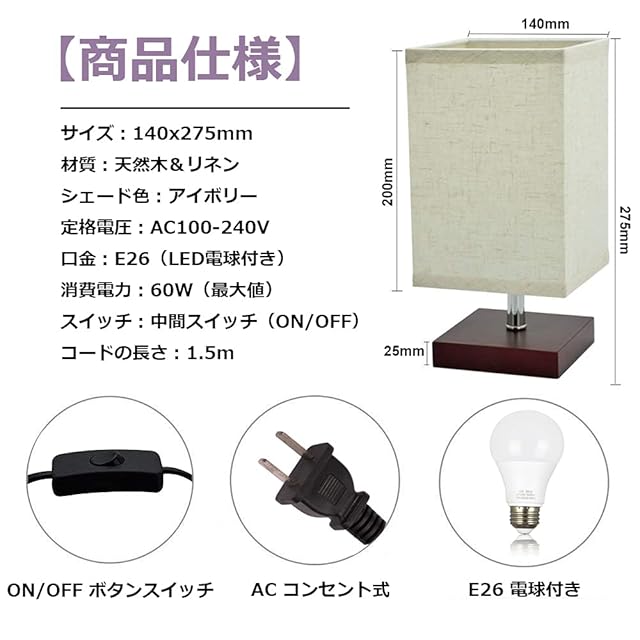 【商品仕様】直径14cm x 高さ27.5cm、定格電圧:AC100-240V、消費電力:60W(最大値)、口金:E26(LED電球付き) 、スイッチ:中間スイッチ(ON/OFF)、シェード:リネン質&アイボリー色、ベース:木製&薄いワインレッド色、コ ードの長さ:1.5m