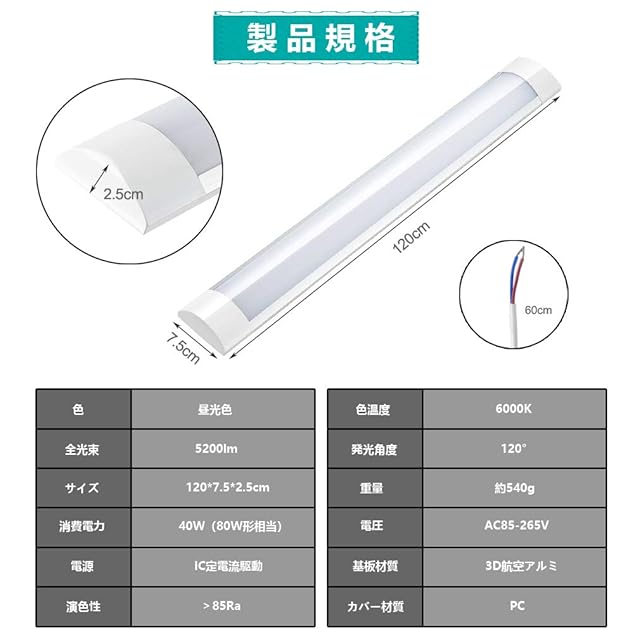 【LEDベースライトの仕様】サイズ:120×7.5×2.5cm 色温度:6000K(昼光色)全光束:5200lm 消費電力:40W(80形相当) 電圧:AC85V〜265V 材質:PC+アルミ 重量:約540g 発光角度:120°。 注意:商品自体にスイッチやリモコンは付いていません!!!
