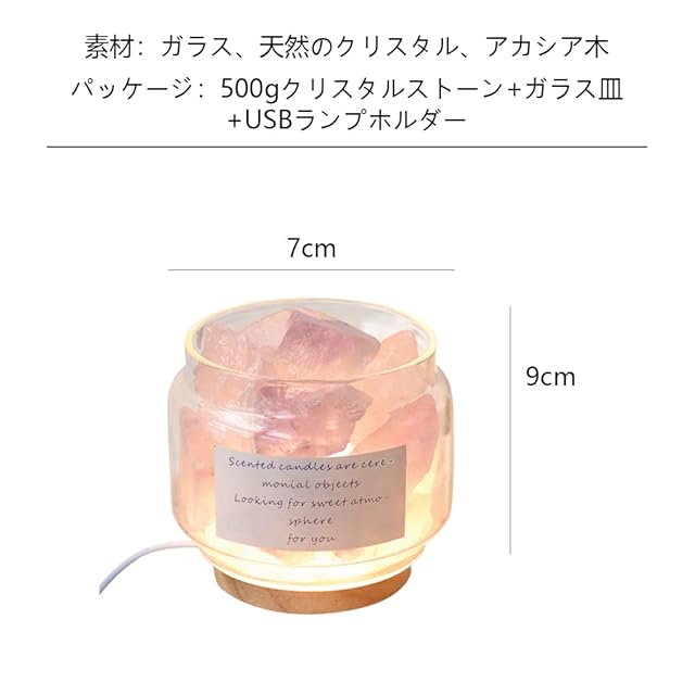 ◆仕様:ヨーロッパ発祥のアロマクリスタルストーンランプ。カラー:ピンク+アメジスト水晶。パッケージ:500gクリスタルストーン+ガラス皿+USBランプホルダー。素材:ガラス、天然のクリスタル、アカシア木。ガラス皿直径は約7cm、高9cm、クリスタルストーン:500g。エッセンシャルオイルは別売り。