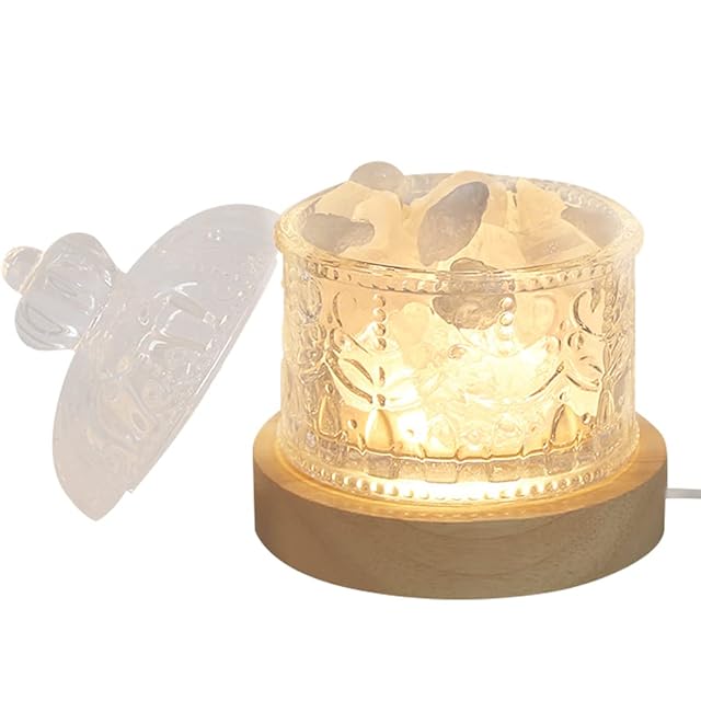 ◆仕様:アロマ用天然ミックスクリスタルストーンランプ、◆素材:ガラス、Aグレード天然のクリスタル(高い光透過率)、木。ランプ台座は厚くてより安定し、ガラス容器は絶妙なパターン付き、USBプラグなし、エッセンシャルオイル無し。ランプ台座はスイッチボタンとUSBケーブル付き、3色のライトが切替え、明るさ調整できます。◆サイズ・重量:ガラス容器:直径*高約8.5*11cm。ガラス皿5.5*9cmガラス蓋5*9cm。クリスタルストーン:300g。◆スタイル:ホワイト+シトリン。◆パッケージ:ホワイトクリスタルストーン≧12個+シトリンストーン≧3個+ガラス容器+USBランプ台座。