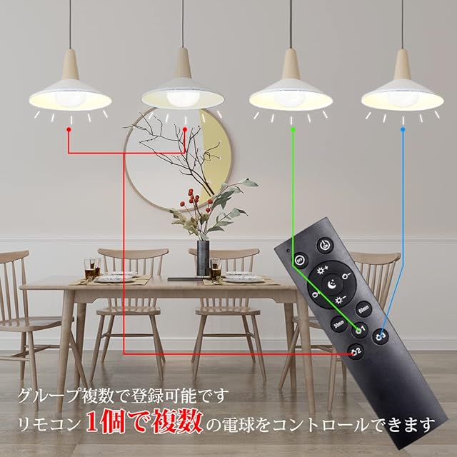 【グループ管理とタイマー機能付き】リモコンで家中の複数のLED電球をグループ分けし、グループ内に登録した電球を一括にON/OFF、明るさ・色を変更することができます。2.4GHz無線式リモコンでペアリング・調光・調色・スイッチon/offなどすべての操作だけでなくタイマー設定して30分間また60分間後に自動オフという機能も搭載されています。点灯しながら寝ることにはすごく便利で。