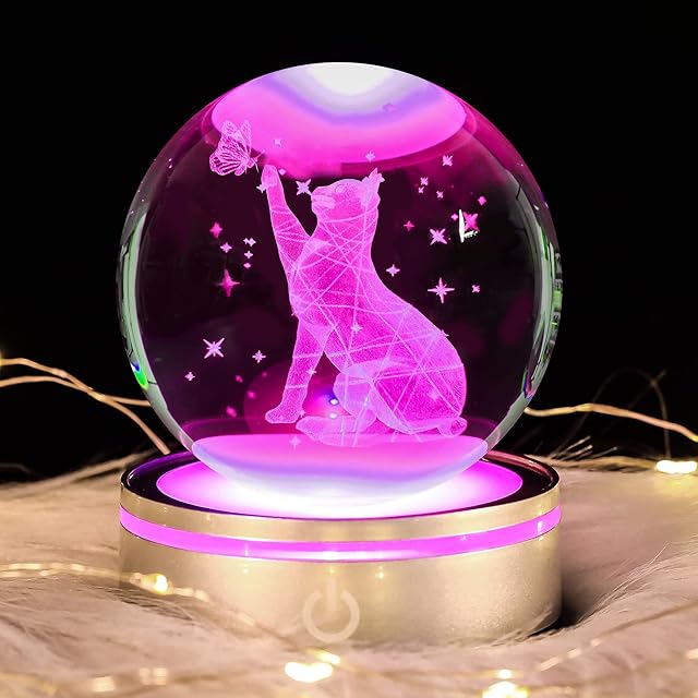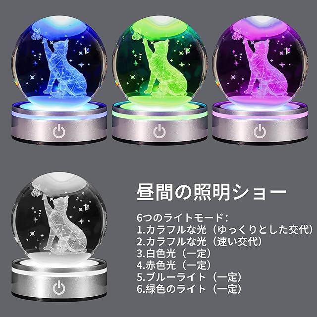 3D猫 水晶球 LEDライトが多色点灯するおしゃれなヒーリング用品 誕生日のプレゼント ナイトライト 透明 雰囲気作り 子供・友人・パートナーへのプレゼント 結婚記念日のプレゼント 母親へのプレゼント 寝室・オフィス・パーティー用の装飾に最適