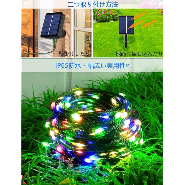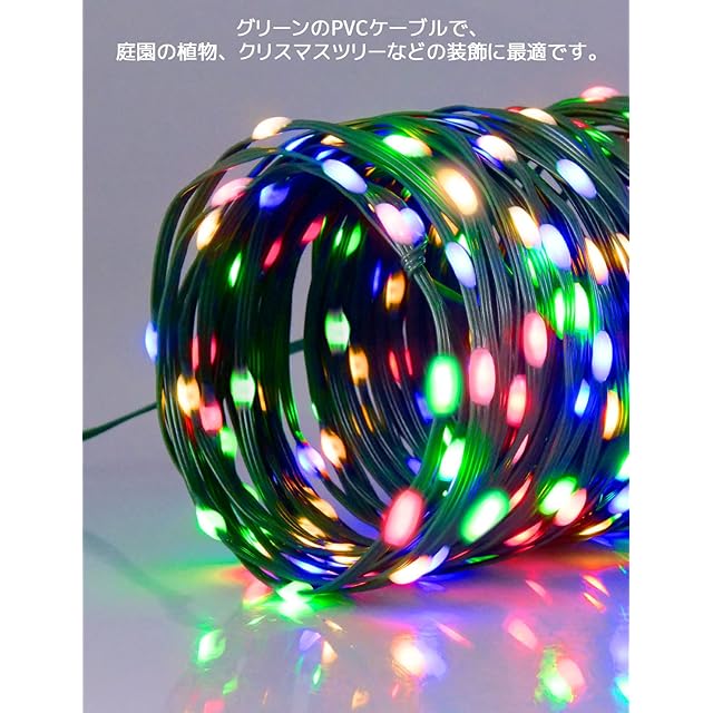 【大きな高輝度LEDで華やかさアップ】LEDイルミネーションライトは従来タイプより2〜3倍明るい大型LEDビーズが採用されており、より華やかに自宅や庭を彩ることができます。ソーラーパネルに充電状態を表すライトがついているため、充電中かどうかがひと目でわかって便利です。200電球を搭載したソーラー式のイルミネーションライトは長さ約20mのライトなので、屋根や木を飾るなど幅広い使い方ができる点も魅力です。「PVCグリーン」ストリングライトのケーブル部分は曲がったり折ったりしても変形と崩壊はしません。好きな形を手軽に作り出来ます。庭園の植物、クリスマスツリー、工芸品、家具などの装飾に最適です。