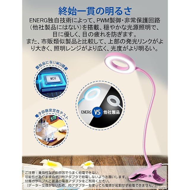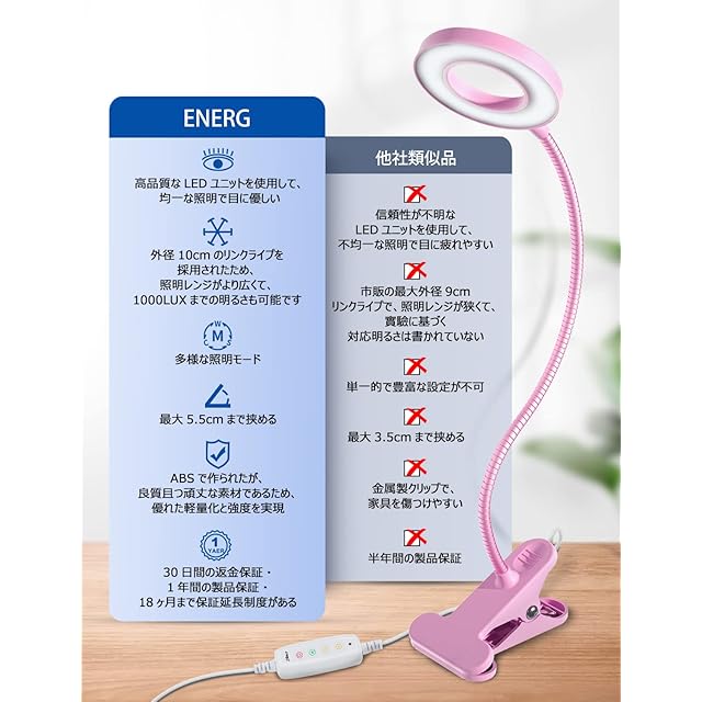 ENERG クリップライト LEDブックライト 目に優しい 1000ルーメン USB給電式 5段階調光 3種色温度 2025年モデル 360度回転 Web会議面接 PC作業・仕事・寝室・卓上・ドレッサー・読書・哺乳・譜面・LEDユニット40個 T12-EN169R ピンク