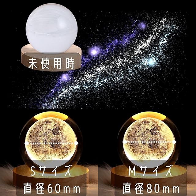 【セット内容】 クリスタルボールx1 木製ベースx1 USBケーブルx1【電源】USB(5V)【ワット数】1.5W 【色温度】3000K(電球色) 【サイズ】クリスタルボール:直径8cm、木製土台:9x2cm 【USBケーブル長】95cm(スイッチ有)