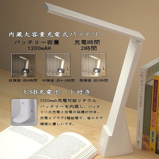 【USB充電ポート・超長寿命】このデスクスタンドはUSBポートを搭載し、USBコネクターを接続して簡単に給電します。最小輝度は完全に充電された状態で最大8時間使用できます。最大輝度で完全に充電される場合に3〜4時間使用できます。