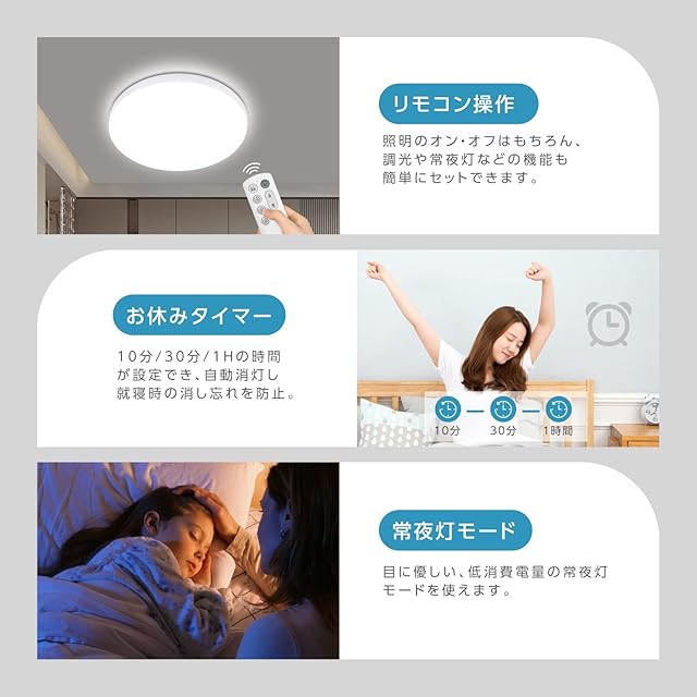 【便利な機能&リモコン付】常夜灯として使用でき、夜中に目が覚めたときでも安心に部屋内を移動できます。お休みタイマーは10分/30分/1時間が設定可能、自動で消灯でき、節電に繋がります。LEDシーリングライトはリモコン付き、機能やライトのオン・オフも簡単にセットできます。