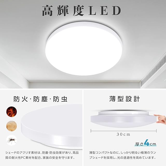 【簡単取付&効果的に照明】工具不要、天井に直接取り付ける照明器具のシーリングライトは、カバーと器具本体の取付をワンタッチで行えます。LEDシーリングライト高発光効率のLEDチップを採用し、均一な光を放ち空間をまんべんなく照します。演色性Ra80以上、人の顔色や食べ物の質感などを自然に見えます。