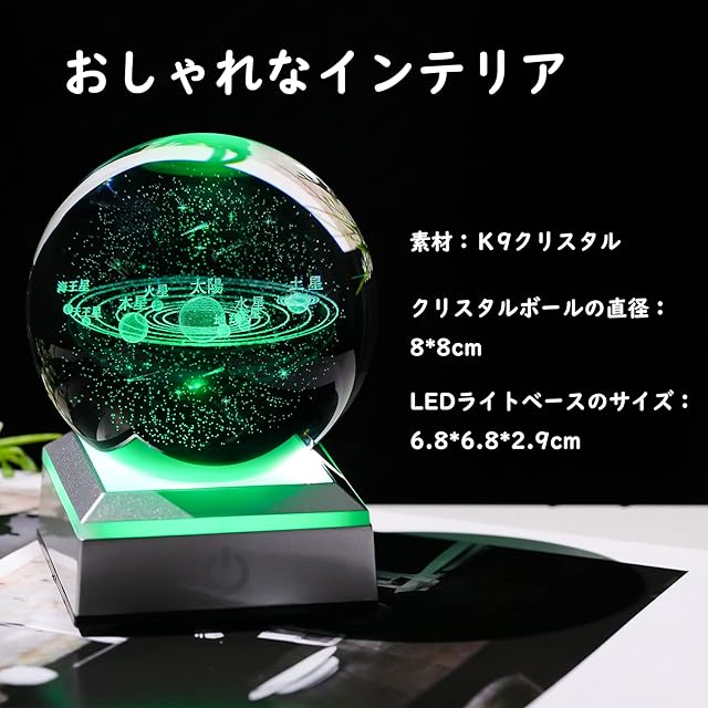 【ギフトラッピング済】パッケージに含まれるもの:3D クリスタルボール 太陽系x 1(8*8*8cm)、1x USBケーブルx 1、お祝いのカードx 1、美しいギフトボックスx 1、LEDライトベースx1(6.78x6.78x2.9cm) おしゃれなインテリアとして夫 、彼氏への記念日プレゼント、誕生日プレゼント、結婚式プレゼント、バレンタインデープレゼントなどにピッタリ!ユニークで貴重な贈り物として最適です。