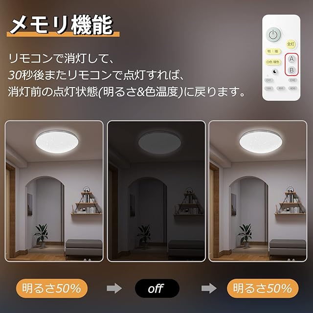 【常夜灯モード&メモリ機能&タイマー機能】普通のシーリングライトより、低ワット数、低消費電力の豆球「常夜灯モード」も付いて、うすく暗い常夜灯モードは夜間授乳や赤ちゃんのお世話に最適。便利なタイマー機能付き、15分、30分、60分のOFFタイマーを設定後、設定時間で消灯する機能で、おやすみ時の消し忘れ防止に役立ちます。また、メモリ機能が付いて、リモコンでメモリ機能はお好みの明るさを記憶して、再開する時、わざわざ調節必要がなくて。