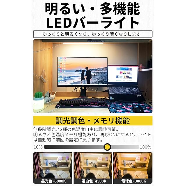【無段階調光・3種の色温度】10-100%無段階調光、3段階調色可能なLEDライト(昼光色6000K・昼白色4500K・電球色3000K)。メモリ機能あり、再びライトを点灯すると、自動的に最後に使用される明るさと色温度に戻ります。作業や勉強に最適な明るい白色の光から温かみのある黄色の光まで調色でき、用途に合わせてお好きな明るさでお使いいただけます。