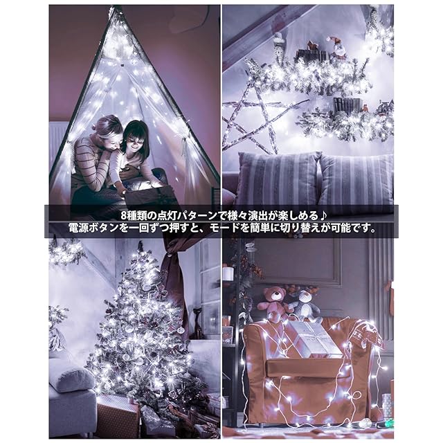 【防水・取付簡単】IP44生活防水仕様で、水に濡れても心配することがないです!コンセントに付属の30V 0.2A 給電器で差し込むだけで、明るく美しいLEDが発光します。消費電力は従来の電球に比べても低く、一般的なイルミネーションに比べて柔らかい幻想的なカラーが大変人気です。クリスマス、ガーデン、結婚式、パーティー、キャンプ、ハロウィン、ホテル、バー、店舗、寝室、玄関、庭、壁、舞台、学校、ショッピングモール、披露宴ツリーなどの装飾としては大活躍です。ご注意:付属の30V 0.2A給電器は防水ではありません。低電圧30Vの安心な設計で過熱を心配する必要がありません。日本の電気用品安全法(PSE)の技術基準に適合した安全性の高い商品です。