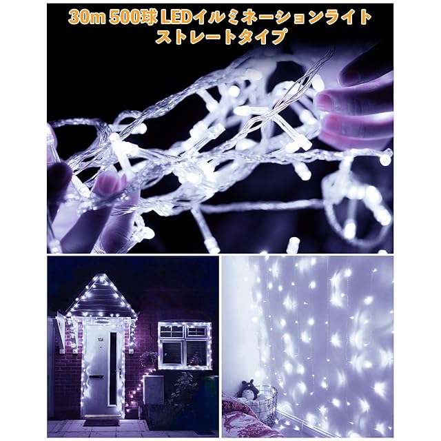 【広範囲に装飾できるの定番ストレートイルミネーションライト】500電球を搭載したLEDイルミネーションライトは長さ約35m(ライト部30m+リード線5m)のライトなので、屋根や木を飾るなど幅広い使い方ができる点も魅力です。直線状のイルミネーションなので曲げたり垂らしたり張ったりといった感じで様々な用途に活用でき最も汎用性の高いアイテムです。庭園の植物、クリスマスツリー、工芸品、家具などの装飾に最適です。自宅や店先などを、華やかな光で演出できるLEDライトは玄関先を飾って季節感を出したり、ベッド周りなどを飾ってリラックス空間を作ったりと、アイデア次第でさまざまな楽しみ方があります。