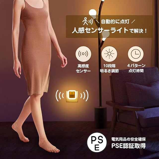 ✿【シーンに合わせて10段階調光可能】 こちらの人感センサーライトは、使用するシーンによってあなたのお好みの明るさに調整することができます。たとえば、夜間の暗い廊下や玄関には明るさ7~10。寝室や子ども部屋では点灯時に明るくなりすぎないよう1~3。化粧室や洗面台、暗めの部屋では明るさ4~6…等、人感センサーライトを設置する場所や目的に応じて明るさを調節できます。 また、コンセント式センサーライトは昼白色か電球色の2色のバリエーションから用途に合わせてお選びいただけます。お仕事やお出かけから家に帰宅した時にパッと光が点灯し周囲を照らしてほしい場所では昼白色。お子さまやご家族の寝室で隣に誰かが寝ていることがあるシーンでは、暖かみがあってリラックスしやすいリラックスカラーの電球色をチョイスすることができるでしょう。
