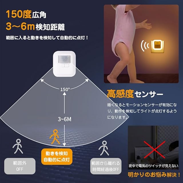 ✿コンセント式センサーライトの説明● 【近づくだけで自動点灯(4段階の時間調整可)】 こちらの人感センサーライトは高感度PIRセンサーが組み込まれています。センサーライトの設置しているコンセントの周囲150°のエリア、かつ、3~6mの範囲内に人の動きを感知したときにライトがONになります。この範囲外では、人感センサーライトがOFFの状態となっています。点灯後に点灯を感知するエリアから人が離れると、設定時間経過後、自動的にライトがオフになります。 しかも、センサーライトの点灯時間はあなたのお好みの時間に調整することができます。調整方法はカンタン。明るさ調整ボタンを長押しするだけ!というシンプルさです。これにより、点灯時間を30秒、60秒、90秒、120秒の4パターンから、あなたのお好みの時間に設定いただくことができます。長めに滞在する化粧室などの場合は点灯時間を長めの120秒に設定したり、ただ通り過ぎるだけの廊下では短めの30秒に設定しておく…といった使い方ができるでしょう。