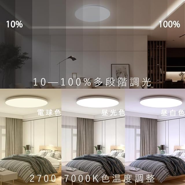 【リモコン付き&調光調色タイプ】LEDシーリングライトは、電源スイッチまたはリモコンで調光および調色できるため、リモートコントロールと使いやすさを実現できます。 長押し無段階調光調色、短押し11段階調光調色、暖色から昼光色までの色温度、明るさはシーンや好みに応じて調整できます。