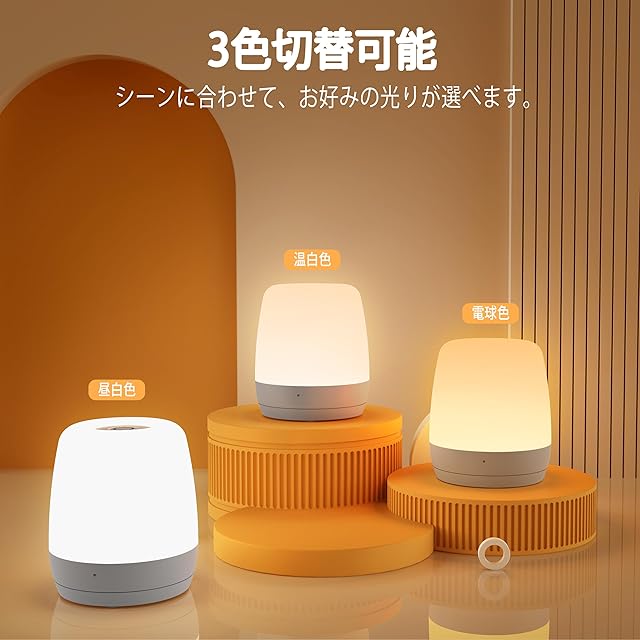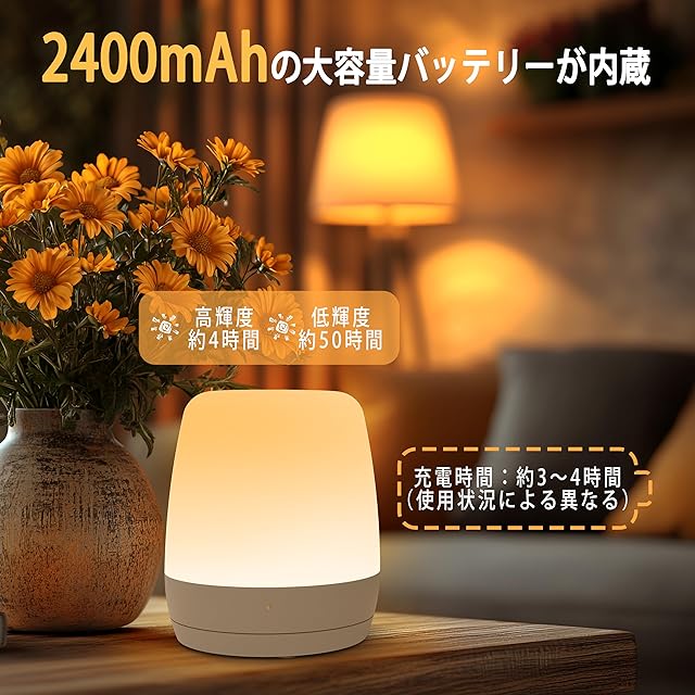 【2400mAh大容量タッチ式ナイトライト】2400mAhの大容量バッテリーが内蔵されて、フール充電の場合、最大輝度で約4時間、最小輝度なら最大50時間連続使用が可能です。照明上部はタッチセンサー式になっており、暗闇でもスイッチを探す必要なく、上部のタッチボタンで簡単に点灯操作や色温度・明るさの調節が行えます。
