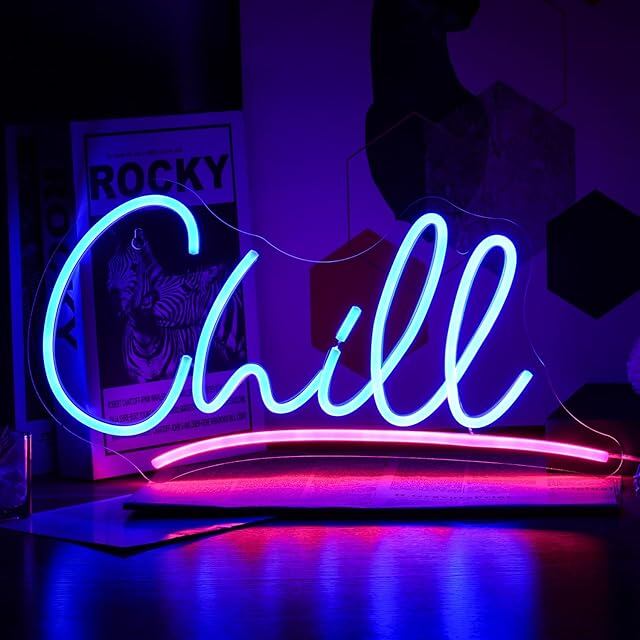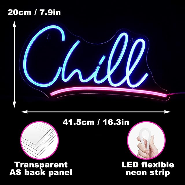 Chillネオン ライト: 青&ピンクのネオン サインは、柔軟なシリコン LED ストリップ ライトと厚みのあるアクリル バック プレートでできています。従来のネオンレターサインに比べ、明るく、安全、耐久性、省電力、無騒音、無発熱、様々なシーンで使いやすいです。