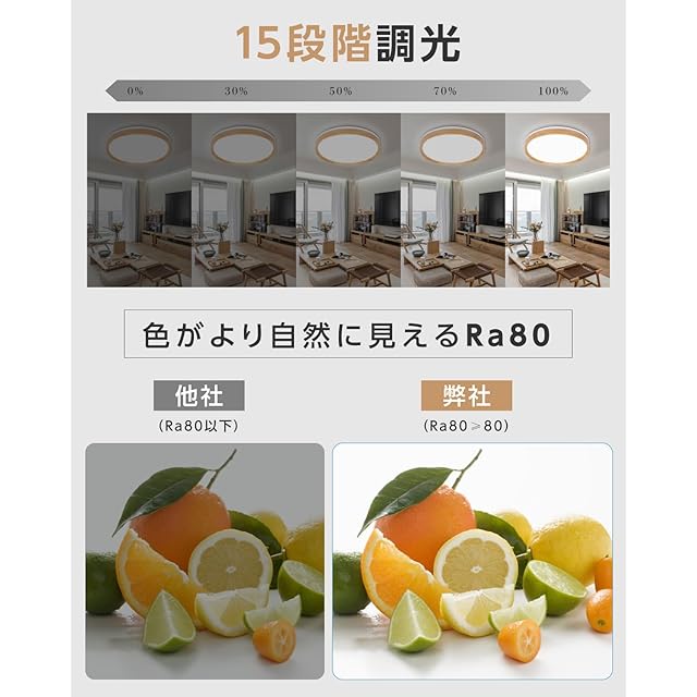 【商品仕様&高い演色性】商品サイズ:Φ30xH6.5cm、カラー:ナチュラル,調光:15段階、消費電力:24W。物体の色彩が自然で心地よく見えます。演色性はRa>80であり、自然光に近い照射が物体の色をより自然に見せます。さらに、CO2の排出を減らし、環境に優しいです。