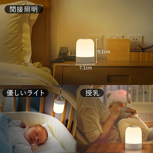 【3色切替可能・無段階調光】本体の上部を2回タッチすると電球色・温白色・昼白色が切り替えことができます。暖色系の光は目にやさしくて、夜間授乳やオムツ替えの時に最適なライトです。タッチセンサーを長押して無段階調光でき、読書を楽しむときは、問題なく文字を読む明るさに調整し、就寝時に点灯したままの場合は、睡眠時の気にならない明るさに調節します。