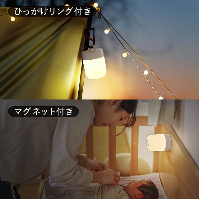 【取っ手付き・マグネット内蔵】底部に取っ手があるので、懐中電灯のように持って歩くことができ、吊るし照明としても使用可能です。またマグネットが内蔵しているので、いろいろなところにこのランプがおけてとても便利です。ランタンもしくは懐中電灯としても使用可能な2WAY仕様でナイトライト、ベッドサイドランプ、授乳ライトとしての使用に最適です。