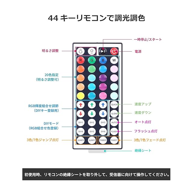 【カラー照明として人気上昇中!】通常のレッド、グリーン、ブルー、ホワイト含めて他色20種類のほか、6種類のカーラーDIYモードを備え自在に調整が可能です。専用の44キーコントローラーで、それぞれのカラーLEDの明るさを制御することができます。※ご注意:W(ホワイト)は若干青みがかった色で蛍光灯の昼光色以上に青いです。