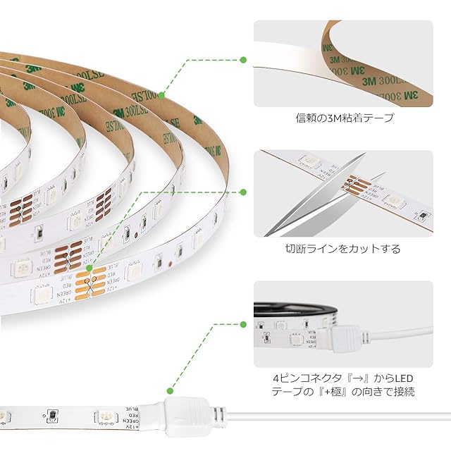 【簡単設置&切断可能】裏面には強力な3M両面テープが付いているため、取り付けが簡単です。柔軟性があるため自由に曲げることができ 、直線はもちろん、曲線のコーブ照明やコーニス照明にも適応します。キッチン、寝室 、食器棚、テレビ、パソコン、バーカウンターなどの装飾や、クリスマスの飾りとしても活躍します。LEDテープを剥がしても痕がつかない、賃貸の方にもお勧め!お好みの長さに切断でき、自由自在にDIY可能!『ご注意:切断すると残った部分はコネクター(別売り)がないと再利用できないことを予めご了承下さい』