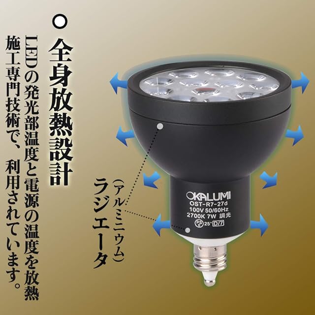 【LEDハロゲン電球の全身放熱設計】LEDの発光部温度と電源の温度を放熱施工専門技術で、利用させています。