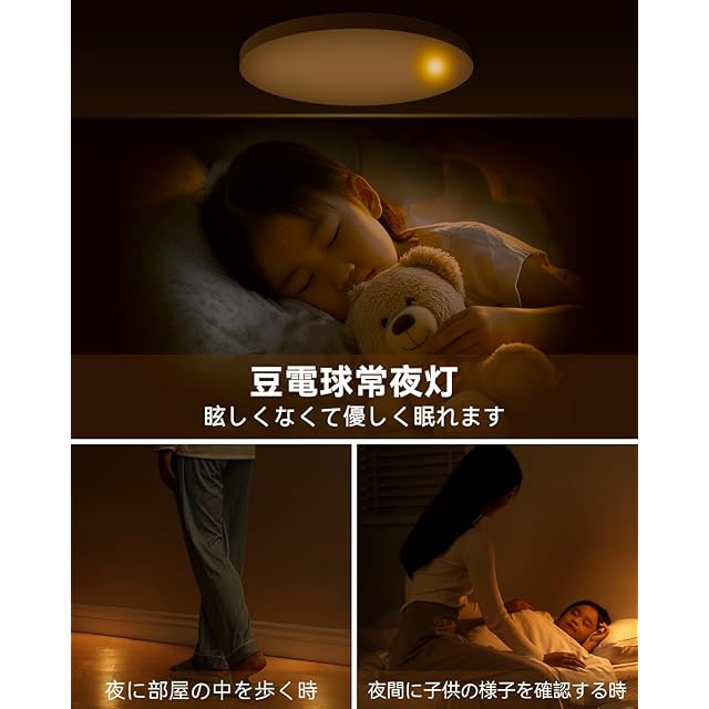 【豆電球常夜灯・記憶機能・定刻消灯】○本格的な豆電球常夜灯(1W):他社の眩しい全体発光式常夜灯と違って、1点だけ発光のため、ちょうどいい感じの暗さで目への刺激がなく、付けまま寝ることに最適です。○進化した記憶機能:他社の記憶機能は常夜灯によって前の設定がリセットされる方が多く、当天井照明器具はいろいろ設定してから常夜灯を使っても、次回点灯時にきちんと常夜灯前の設定を再現しますので、設定がリセットされるため毎日設定し直しの悩みがなくなります!○消灯機能:設定して15/30分後自動的に消灯するため、消し忘れの心配はありません。