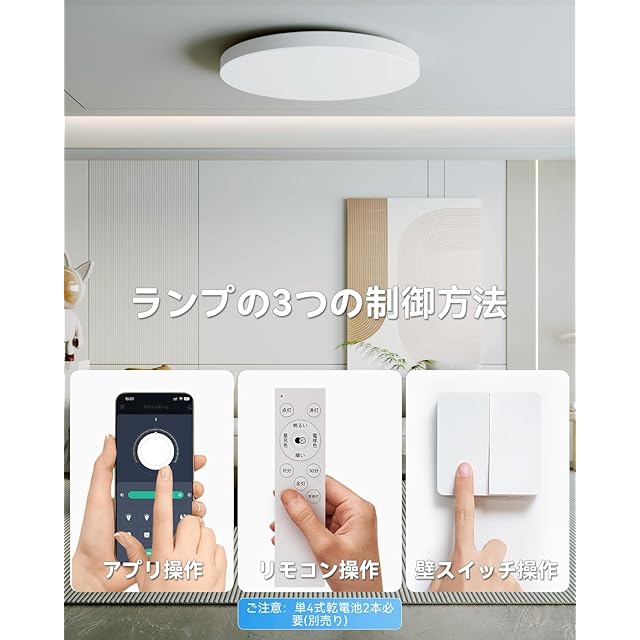 【リモコン&スマホ操作】 ①2.4Gリモコン:最大制御範囲は20mで、シーリングライトの方向を向けずに操作可能です(赤外線リモコンではありません)。※リモコンには単4乾電池が必要です(別売り)。 ②スマホアプリ対応:LampSmart Proアプリをダウンロードし、説明書通りにペアリングすれば、リモコンがなくてもスマホで簡単にシーリングライトを操作できます。