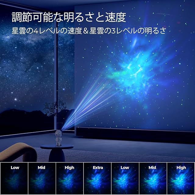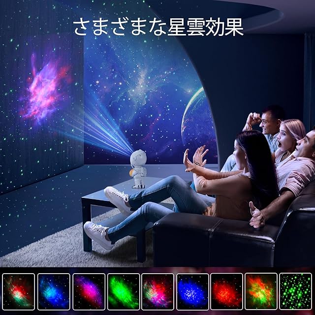 【8-星雲効果32モード組み合わせ】宇宙飛行士スタープロジェクターは星と星雲のパターンを作成します、8つの星雲効果、1つの星効果;星雲の4レベルの明るさと速度、星の3レベルの明るさと速度。星雲と星は混ぜて使うことも、別々に使うこともできる。リモコンでパターン、明るさ、回転速度を調整し、お好みの投影効果をカスタマイズできます。