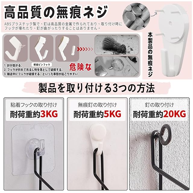 【3つの設置方法で便利】粘着フック、無痕ネジ、金属ロックネジの3種類の取り付け方法を選べます。どんな壁にも対応でき、設置が簡単。賃貸でも安心してご利用いただけます。(壁に付ける棚、ウォールシェルフ 賃貸、壁 収納、棚 壁掛け、壁 ラック)