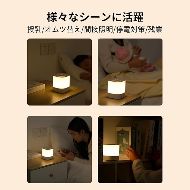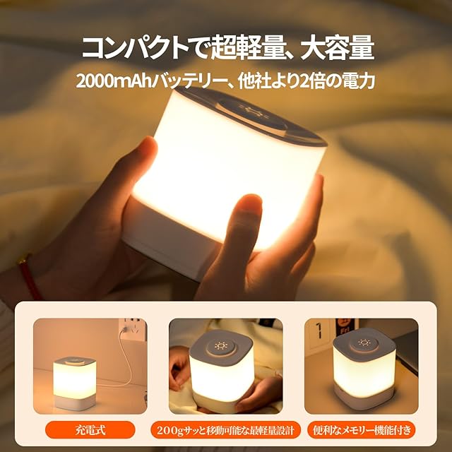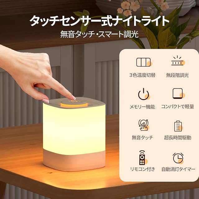 <p>1.3色温度調節:製品は複数のカラーオプションを提供します。異なる色の光を選択することで、さまざまなムードや環境に合わせた照明を楽しむことができます。</p> <p>2.無段階調光:製品は無段階の調光機能を備えています。好みの明るさに合わせて照明を調整することができ、快適な照明環境を実現できます。電源ボタンを長押しすることで、ライトの明るさを選べます。自分の好みに合わせて、輝度が自由に切り替えられます。</p> <p>3. 照明のメモリー機能:製品は照明の設定を記憶する機能を持っています。好みの設定を一度保存することで、再度使用する際に手間をかけずに同じ設定を呼び出すことができます。</p> <p>4.コンパクトで軽量:この製品はコンパクトで軽量なデザインです。持ち運びが簡単で、旅行やキャンプなどのアウトドア活動にも適しています。場所を取らず、どんな場所でも便利に使用することができます。</p> <p>5. 静音タッチ操作:この製品は静音タッチ操作を採用しています。タッチパネルに触れるだけで操作でき、音がしないため、夜間や静かな環境での使用に最適です。</p> <p>6. 超長時間連続使用: 2000mAhの大容量バッテリーが内蔵されて、1日8時間点灯の場合、1回の充電で1ヶ月以上使用可能です。一度の充電で長時間使用できるため、頻繁な充電の必要がありません。</p> <p>7.多機能リモコン対応:このベッドサイドランプはタッチセンサー式なので、指先でボタンを触れるだけで電源オン/オフ、色温度、無段階調光をコントロールできます。さらに、全て操作できる多機能リモコンを付き、手元で自動消灯タイマー機能を設定し、ベッドに寝転んでも楽々に使えます。使いやすいランプで授乳用ライト・おむつ替え・夜中のトイレの照明として活躍できます。隣りの人を邪魔しなく、ベッドサイドランプとしては最適です。</p> <p>8.自動消灯タイマー機能:このナイトランプは消灯タイマー機能を備えており、リモコン操作で15分・30分・60分の消灯タイマーを切替えます。安心してぐっすり眠るまでに自動的に消灯し、消し忘れの心配もなく、大人と子供の睡眠に役立ちます。電気も無駄にせずにご利用頂けます。</p> <p>· 目に優しいナイトライトは夜中に赤ちゃんのお世話、お年寄りの躓き転倒防止に大変重宝です。小型充電式LEDライトの重量は200gだけで、とても軽量です。子供とお年寄りでも持ち運びやすい。</p> <p>· 充電式LEDライトは授乳ライト、読書灯、ベッドサイドランプ、ナイトライト、間接照明、テーブルランプ、キャンプランタンだけでなく、停電、災害の時にも懐中電灯の代わりに、防災用具としても幅広く大活躍に使えます。</p> <p>·おしゃれな置き型間接照明は人気の出産祝いプレゼント、敬老プレゼント、結婚祝いプレゼント、誕生日プレゼント、引越し挨拶用ギフト、クリスマスプレゼントです。コンパクトなナイトライトで、長上や家族や友達へのプレゼントにもお勧めです。</p> <p>【商品仕様】</p> <p>·材質:ABS、PC</p> <p>·定格電圧:DC5V</p> <p>·色温度:昼白色/温白色/電球色</p> <p>·輝度:0-45LM</p> <p>·バッテリー容量:2000mAh</p> <p>·サイズ:約幅90×奥行90×高さ100mm</p> <p>·質量:約200g</p> <p>·リモコン:1個付き</p>