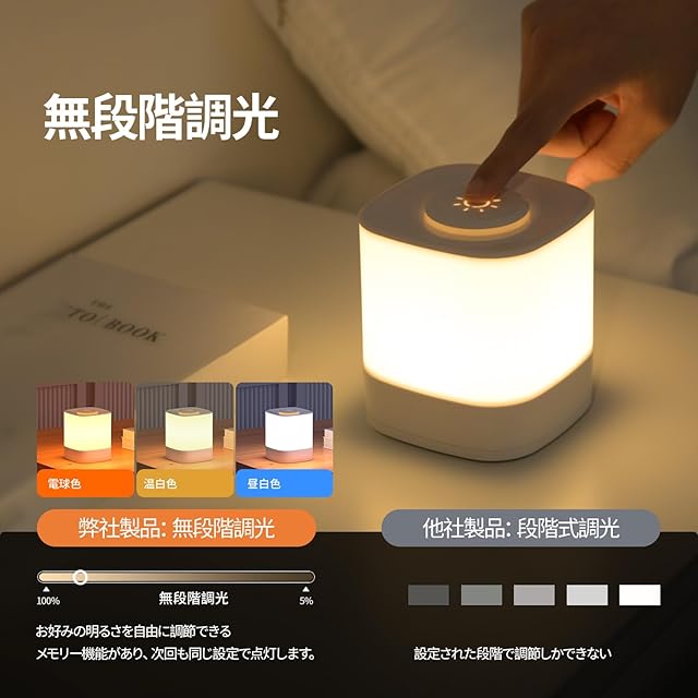 <p>便利なナイトライト、ベッドサイドランプ、ルームライト、授乳ライト、テーブルランプ、おしゃれな置き型間接照明です。</p> <p>製品特徴</p> <p>1. 3色温度調節:製品は複数のカラーオプションを提供します。異なる色の光を選択することで、さまざまなムードや環境に合わせた照明を楽しむことができます。</p> <p> 電球色:リラックスして目が疲れにくいので、リビング、ダイニングや寝室などリラックスできて落ち着いた気分になりたい場所におすすめです。</p> <p> 温白色:光が柔らかくて均一で、暗過ぎず、明る過ぎないというバランスを保った色が魅力です。長時間の使用でも目に負担をかけなく、使用できます。</p> <p> 昼白色:爽やかでモダンな雰囲気を作り出し、本を読んだり、細かい作業をしたりするには最適です。書斎や子供の勉強部屋やキッチンなどの場所に適しています。</p> <p>2. 無段階調光:製品は無段階の調光機能を備えています。好みの明るさに合わせて照明を調整することができ、快適な照明環境を実現できます。電源ボタンを長押しすることで、ライトの明るさを選べます。自分の好みに合わせて、輝度が自由に切り替えられます。</p> <p>3. 照明のメモリー機能:製品は照明の設定を記憶する機能を持っています。好みの設定を一度保存することで、再度使用する際に手間をかけずに同じ設定を呼び出すことができます。</p> <p>4. コンパクトで軽量:この製品はコンパクトで軽量なデザインです。持ち運びが簡単で、旅行やキャンプなどのアウトドア活動にも適しています。場所を取らず、どんな場所でも便利に使用することができます。</p> <p>5. 静音タッチ操作:この製品は静音タッチ操作を採用しています。タッチパネルに触れるだけで操作でき、音がしないため、夜間や静かな環境での使用に最適です。</p> <p>6. 超長時間連続使用: 2000mAhの大容量バッテリーが内蔵されて、1日8時間点灯の場合、1回の充電で1ヶ月以上使用可能です。一度の充電で長時間使用できるため、頻繁な充電の必要がありません。</p> <p>環境保護と省電力バッテリーを使用し、突然の停電、災害対策にもなります。</p> <p>多機能のベッドサイドランプは子供からお年寄りまで、全年齢対象が使用できます。</p> <p> 目に優しいナイトライトは夜中に赤ちゃんのお世話、お年寄りの躓き転倒防止に大変重宝です。小型充電式LEDライトの重量は200gだけで、とても軽量です。子供とお年寄りでも持ち運びやすい。</p> <p> 充電式LEDライトは授乳ライト、読書灯、ベッドサイドランプ、ナイトライト、間接照明、テーブルランプ、キャンプランタンだけでなく、停電、災害の時にも懐中電灯の代わりに、防災用具としても幅広く大活躍に使えます。</p> <p> おしゃれな置き型間接照明は人気の出産祝いプレゼント、敬老プレゼント、結婚祝いプレゼント、誕生日プレゼント、引越し挨拶用ギフト、クリスマスプレゼントです。コンパクトなナイトライトで、長上や家族や友達へのプレゼントにもお勧めです。</p> <p>【商品仕様】</p> <p> 材質:ABS、PC</p> <p> 定格電圧:DC5V</p> <p> 色温度:昼白色/温白色/電球色</p> <p> 輝度:0-45LM</p> <p> バッテリー容量:2000mAh/4000mAh</p> <p> サイズ:約幅90×奥行90×高さ100mm</p> <p> 質量:約200g</p>