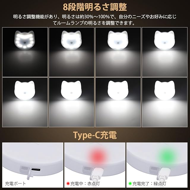 猫頭の形 読書灯は猫のイメージをデザインのインスピレーションにして、猫の頭の形をしており、とても独特で可愛くて、照明体験にかわいさと面白さを加えます。 純白と電球色 読書灯は純白と電球色のチップを使用しており、色は純粋で、明るさは照明のニーズに十分であるため、車内を明るく照らします。お好みの光の色をお選びいただけます。 RGBWチップ 発光効果を高めるため、読書灯はRGBWのカラフルなチップを使用しており、通常のRGBチップよりも明るく、電力を節約します。多彩な発光色で車内の雰囲気をさらに高めます。 1400mAhバッテリー 読書灯は1400mAhの大容量バッテリーを採用しており、10時間以上使用可能です。頻繁に充電しなくても、連続した安定した明るさと十分な点灯時間を提供します。 強力磁石内蔵 磁気設計を採用しており、10*3mmの強力磁石が4つ内蔵されており、読書灯をしっかりと固定できます。いつでも灯を取り外すことができ、他の一時的な照明に使用できます。 明るさ調整 読書灯には明るさ調整機能があり、明るさは約30%〜100%で、自分のニーズやお好みに応じて読書灯の明るさを調整できます。 メモリーモード 読書灯にはメモリーモードがあり、最後の照明モードを記憶できます。 再度点灯すると、消灯前に設定された照明モードが維持されます。
