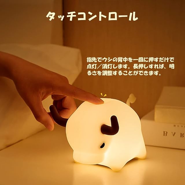 商品名:デスクライト ナイトライト ウシ LED ランプ 牛 うし 授乳ライト 照明 テーブルランプ 寝室 卓上 子供部屋 おやすみライト 無段階調光 間接照明 シリコン 目に優しい おしゃれ USB充電式 枕元 ライト 出産祝い 誕生日 プレゼント
